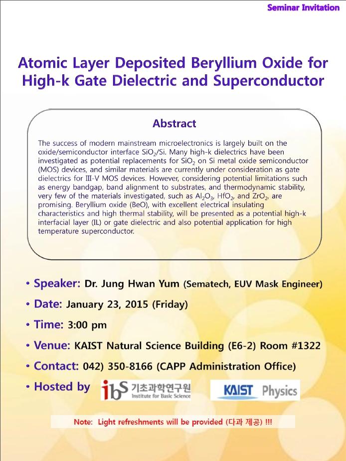 [CAPP Seminar] Atomic Layer Deposited Beryllium Oxide for High-k Gate Dielectric and Superconductor