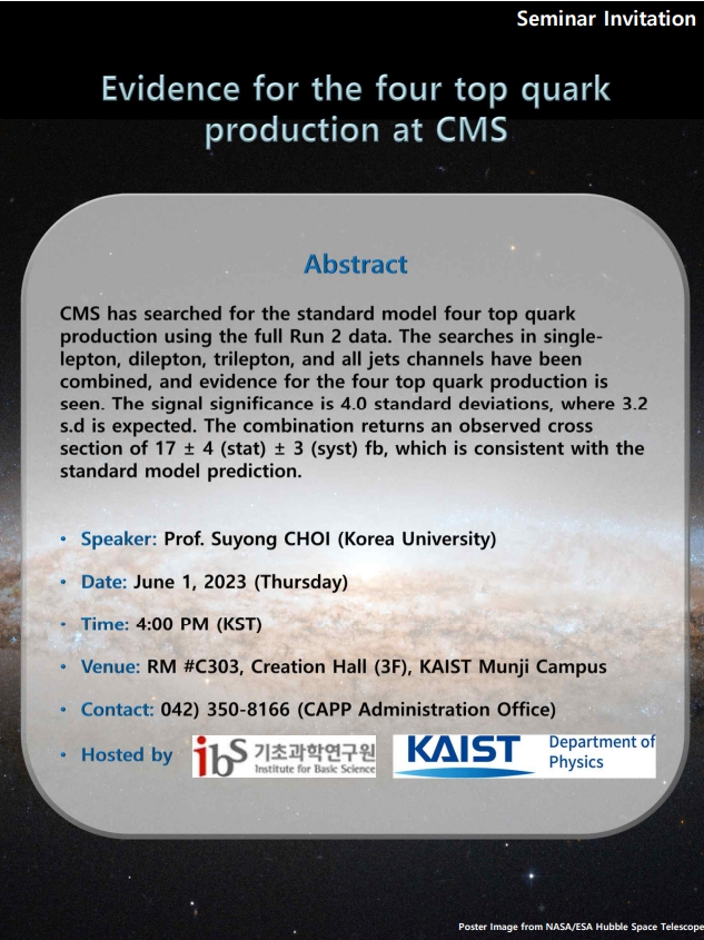 [CAPP Seminar] Evidence for the four top quark production at CMS (Changed: April 27, 4PM --> June 1, 4PM)