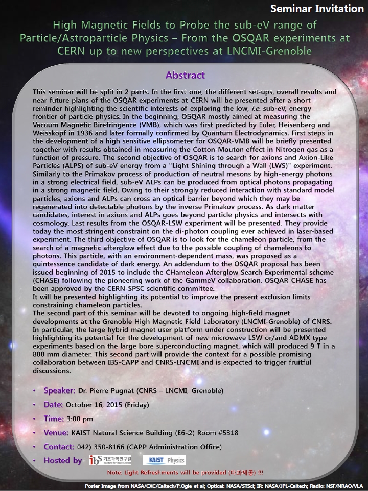 [CAPP 세미나] High Magnetic Fields to Probe the sub-eV range of Particle/Astroparticle Physics - From the OSQAR experiments at CERN up to new perspectives at LNCMI-Grenoble